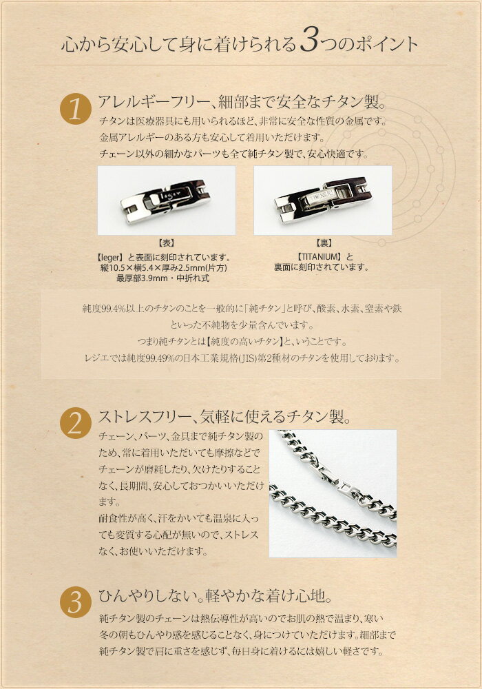 さらに詳しく>>純チタン製チェーンネックレスですので 金属アレルギーや敏感肌の方でも 安心してお使いいただけます。