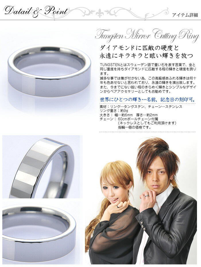 ■タングステンとは,スウェーデン語で重い石を表す言葉で、金と同じ重度を持ち,ダイヤに匹敵するほどの硬度を誇り,キラキラした鏡面の輝きを放ちます。